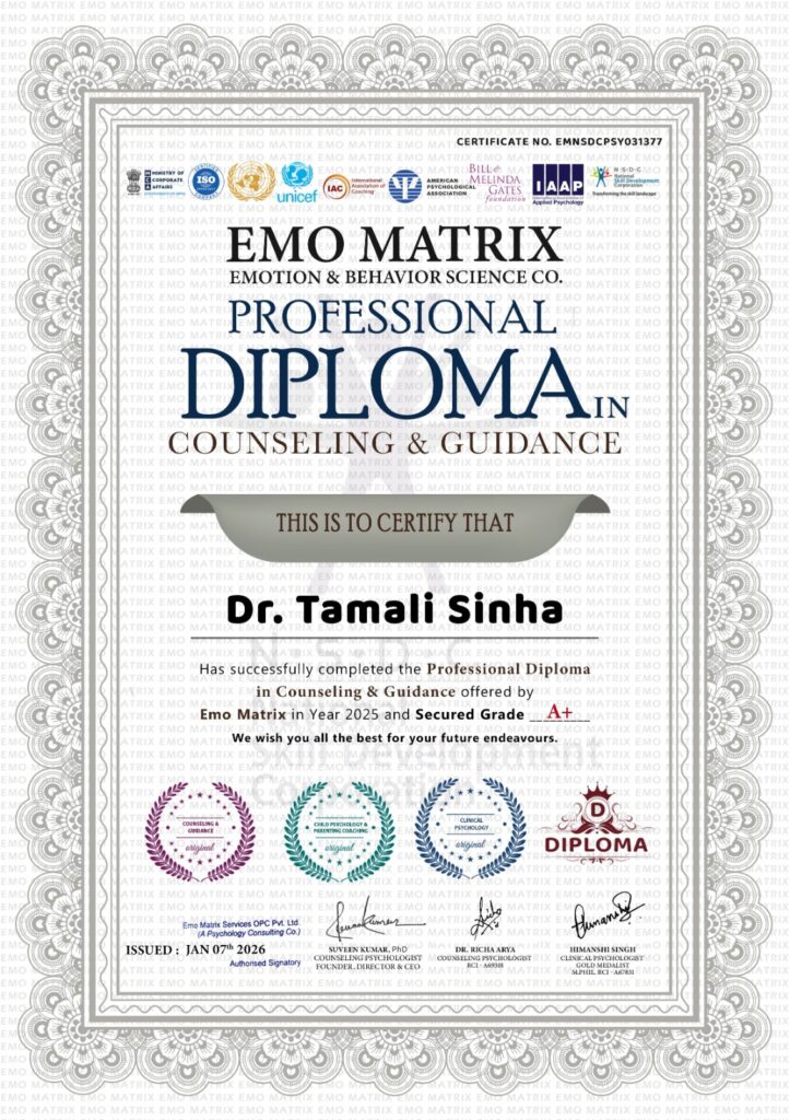 Dr. Tamali Sinha holds a Ph.D. in Life Sciences and brings together the depth of scientific understanding with the sensitivity of human emotions. Her work exists at the intersection of psychology, lived experience, and creative expression.